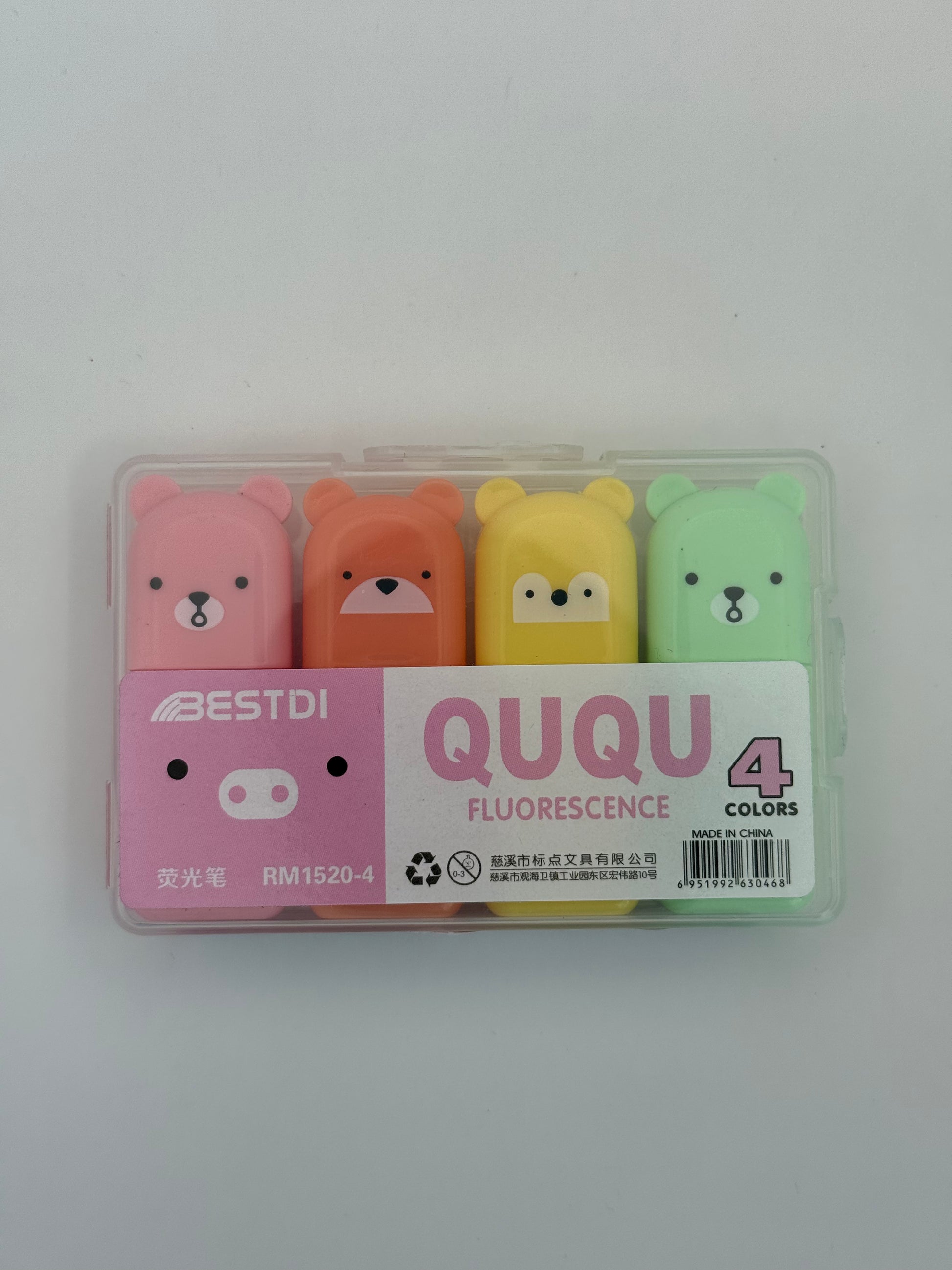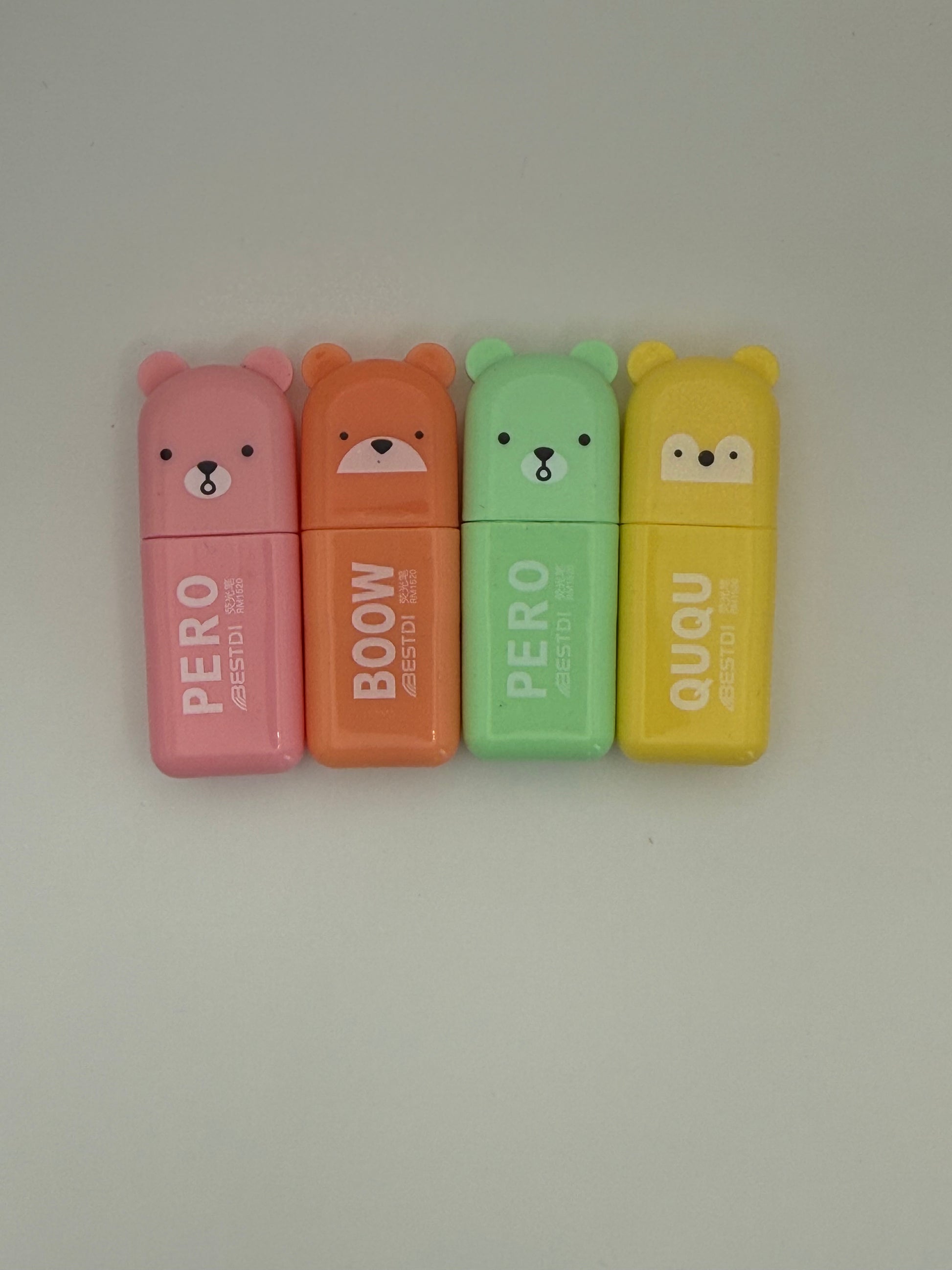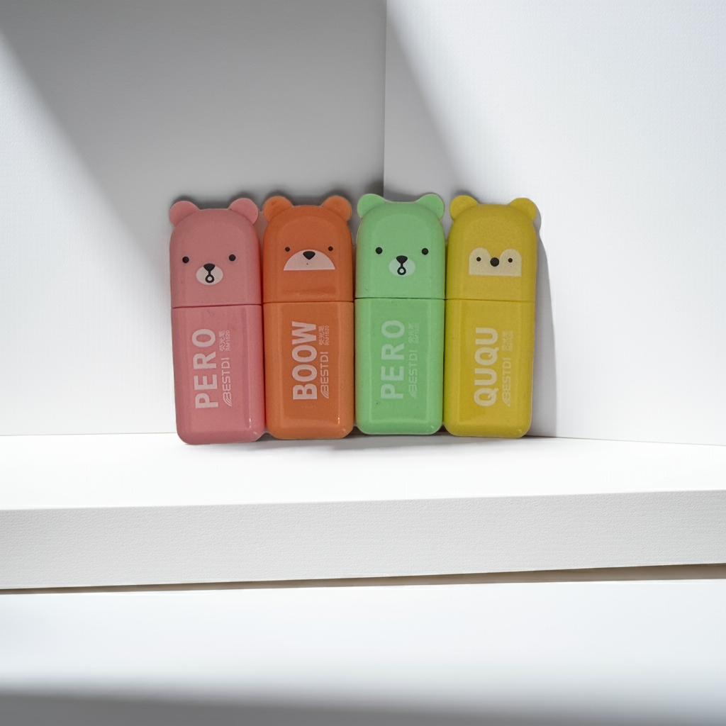 Diese niedlichen Mini-Leuchtstifte bringen Farbe und Freude in jeden Alltag! Im praktischen 4er-Set kommen sie in vier fröhlichen Pastell-Farben – rosa, orange, gelb und hellgrün. Jeder Stift hat ein Bärchen-Gesicht. Ideal für Schule, Büro oder als kleines Geschenk – diese Mini-Textmarker zaubern garantiert ein Lächeln ins Gesicht.