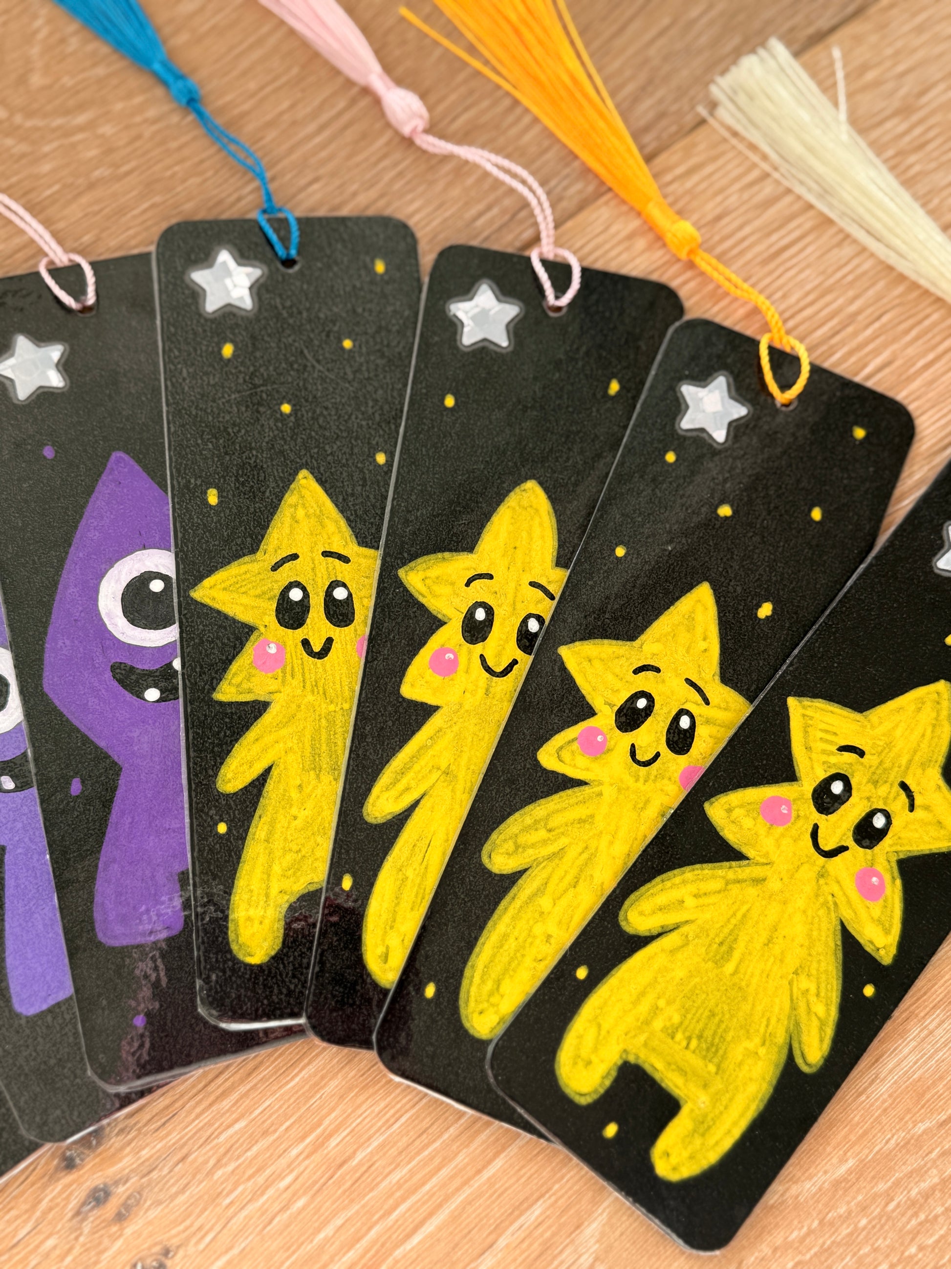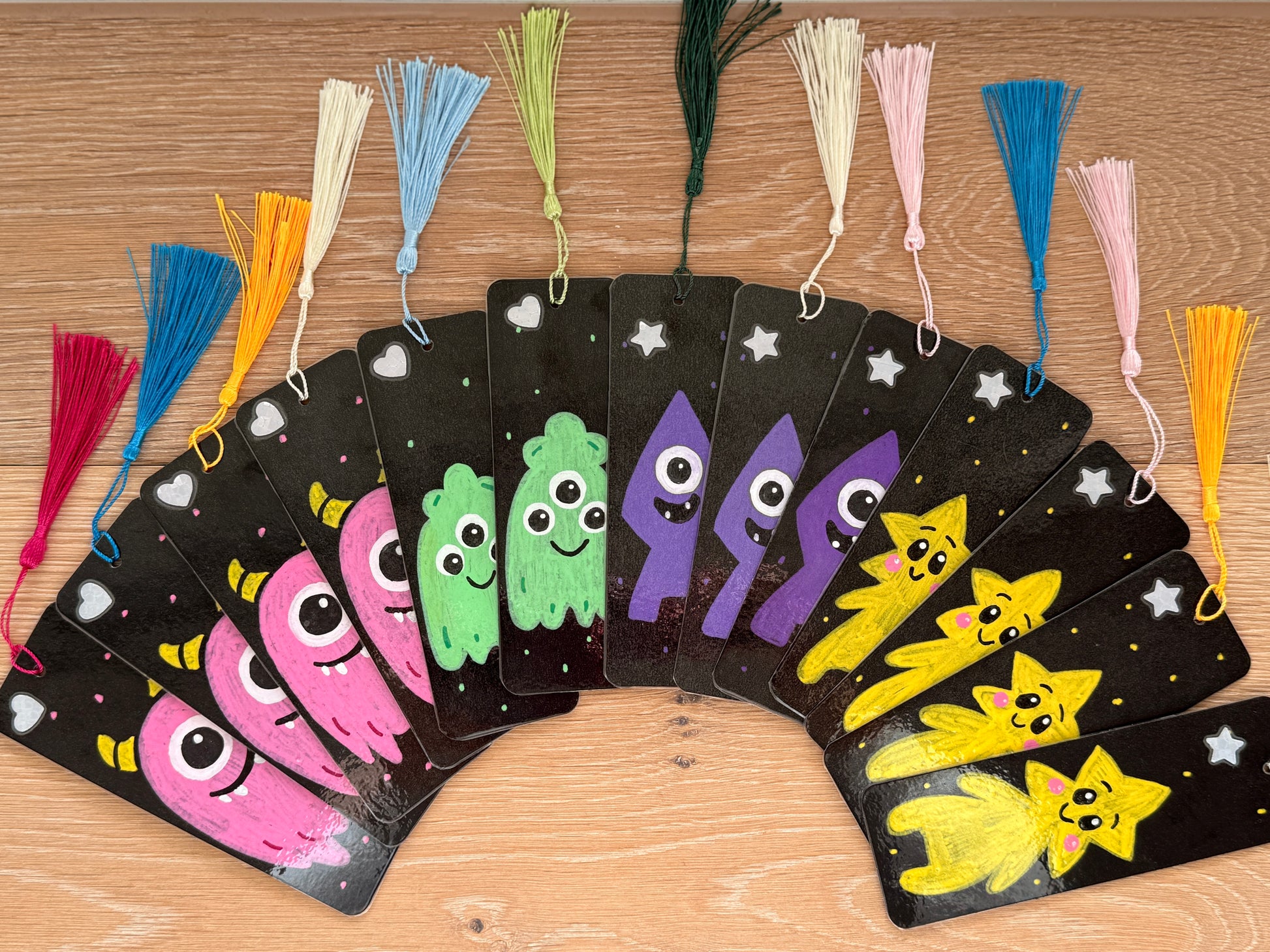 Jedes Lesezeichen ist ein Unikat: handbemalt mit POSCA-Stiften, nummeriert, laminiert und dadurch besonders robust – perfekt für den Schulalltag, die Bibliothek oder das abendliche Lesen im Bett.