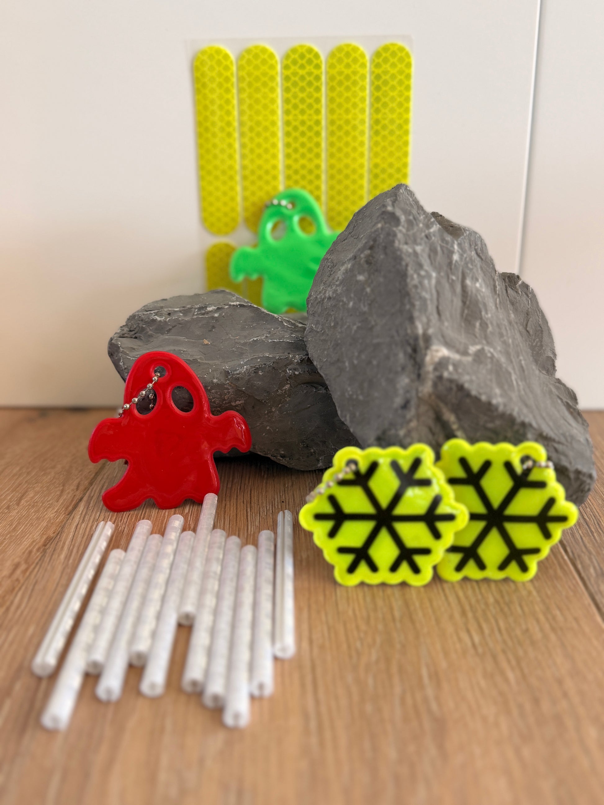 - 🟡 10 × reflektierende Aufkleber (gelb): für Velo, Scooter oder Helm